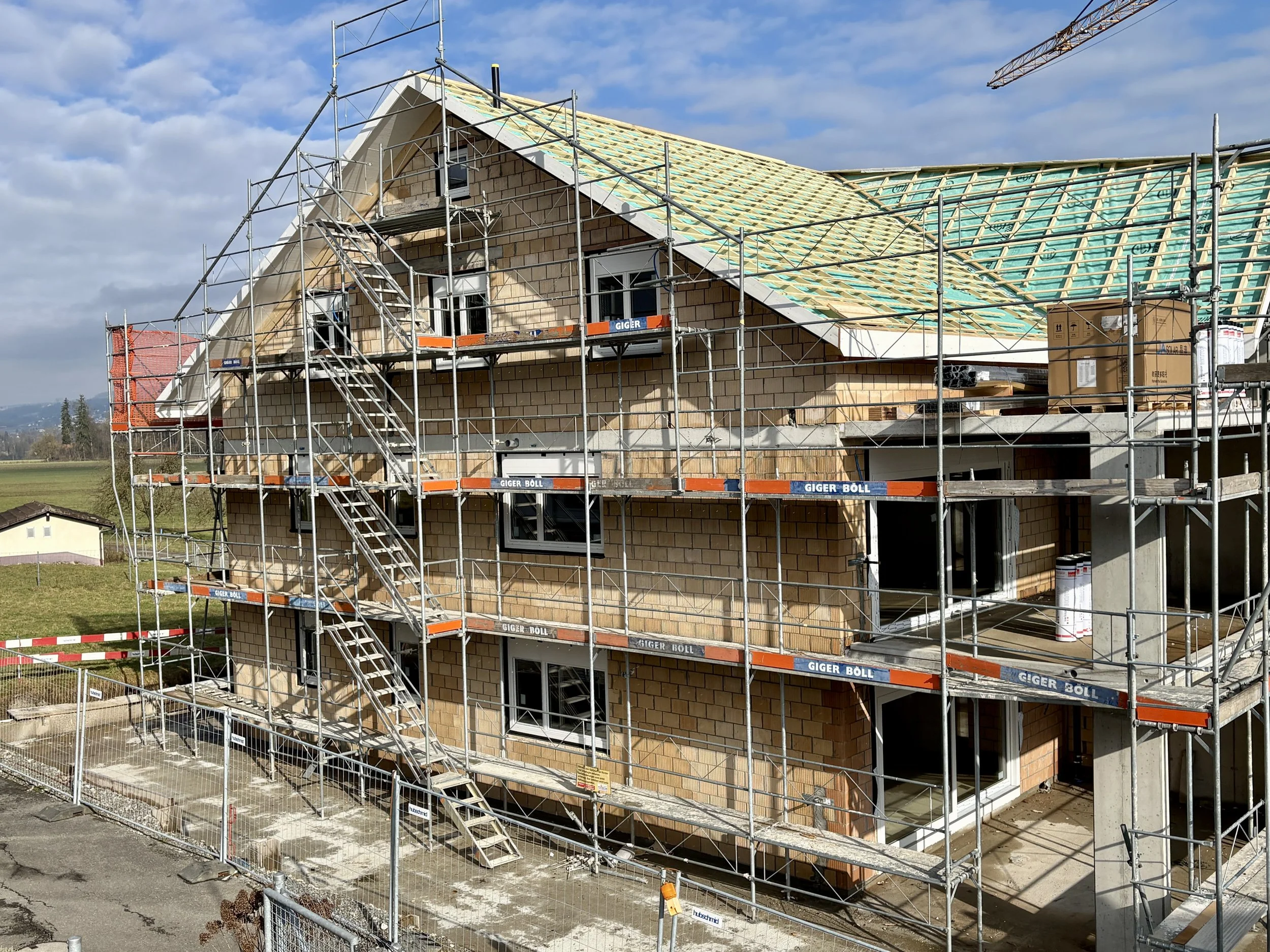 20. März 2025: bestehendes Lagergebäude wurde zurückgebaut 23. April 2025: Start Aushub August /September 2025: Erdgeschoss im Bau und Decke erstellt 24. Oktober 2025:& 2. OG ist erstellt 14. November 2025:Dachgeschoss im Bau 06. Dezember 2025:Baumeister-Arbeiten sind abgeschlossen; Dachstuhl folgt in den nächsten Tagen Bild Links - 23. Dezember 2025: Dachstuhl fertigBild Rechts - 31. Januar 2026: Fenster eingebaut